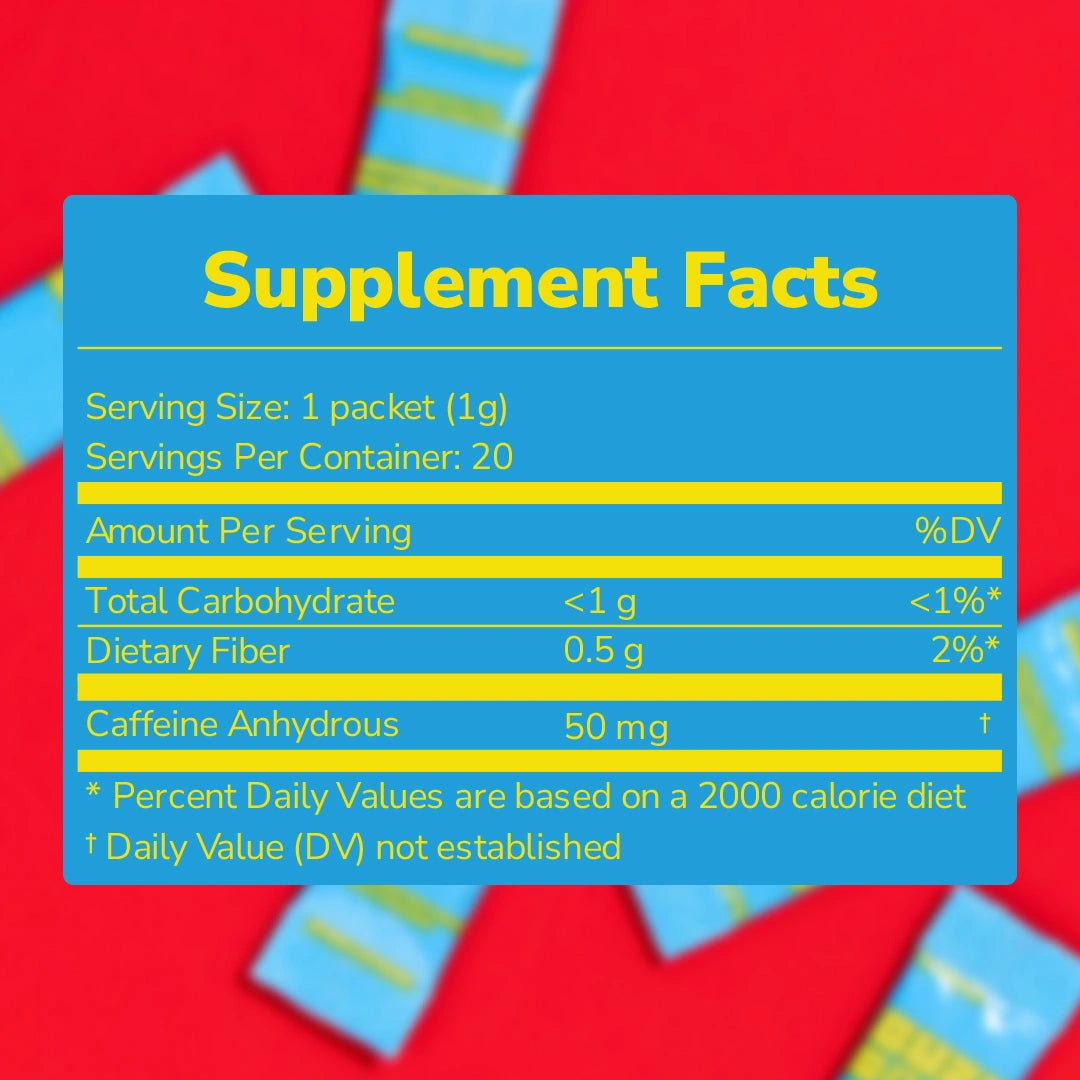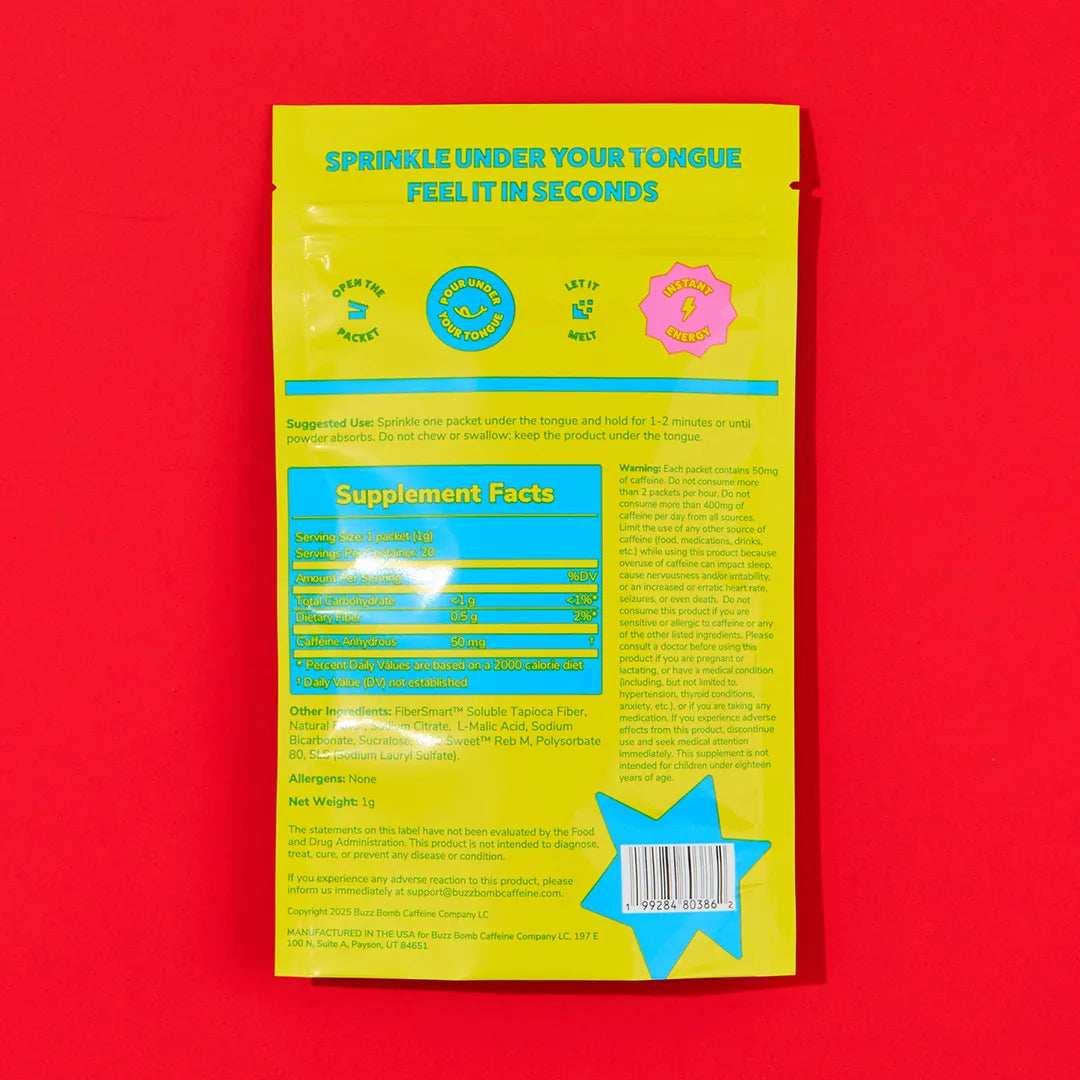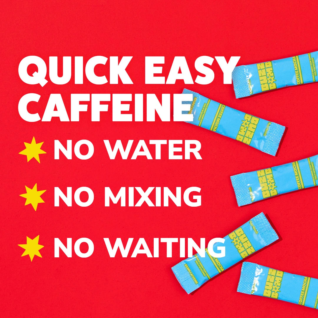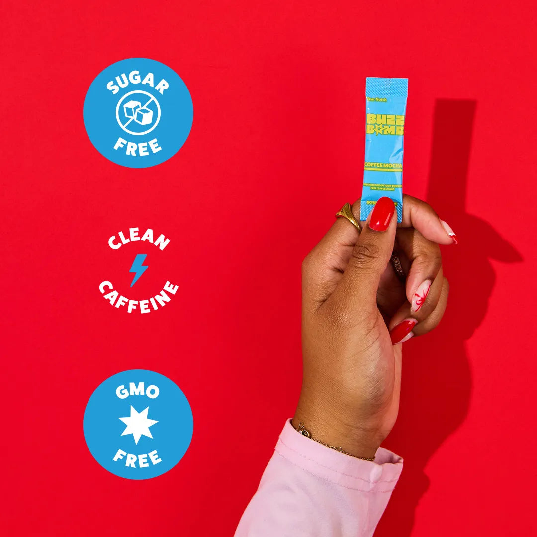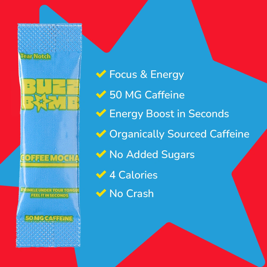 Replace your coffee with a buzz that doesn’t leave you feeling jittery later. This 20 pack of Buzz Bomb’s 50 mg caffeine sticks has all-natural energy, no sugar, and a delicious Coffee Mocha flavor. Try quick dissolving, built-for-busy-lives energy that leaves a great feeling in your mind AND body.
