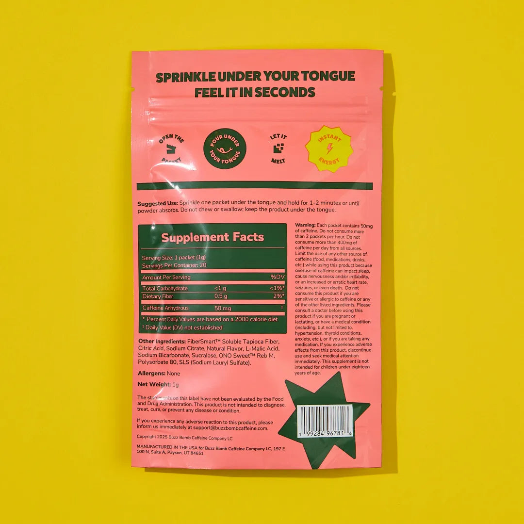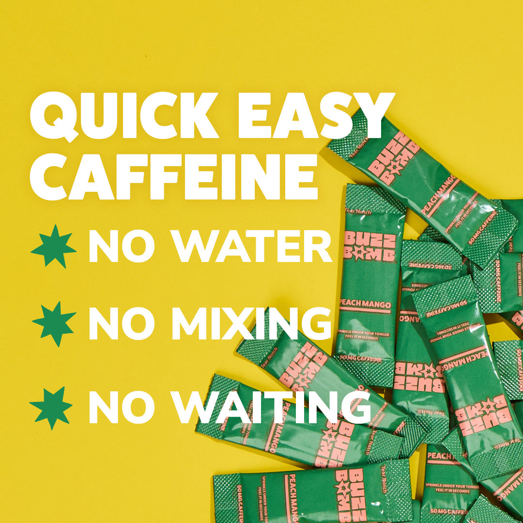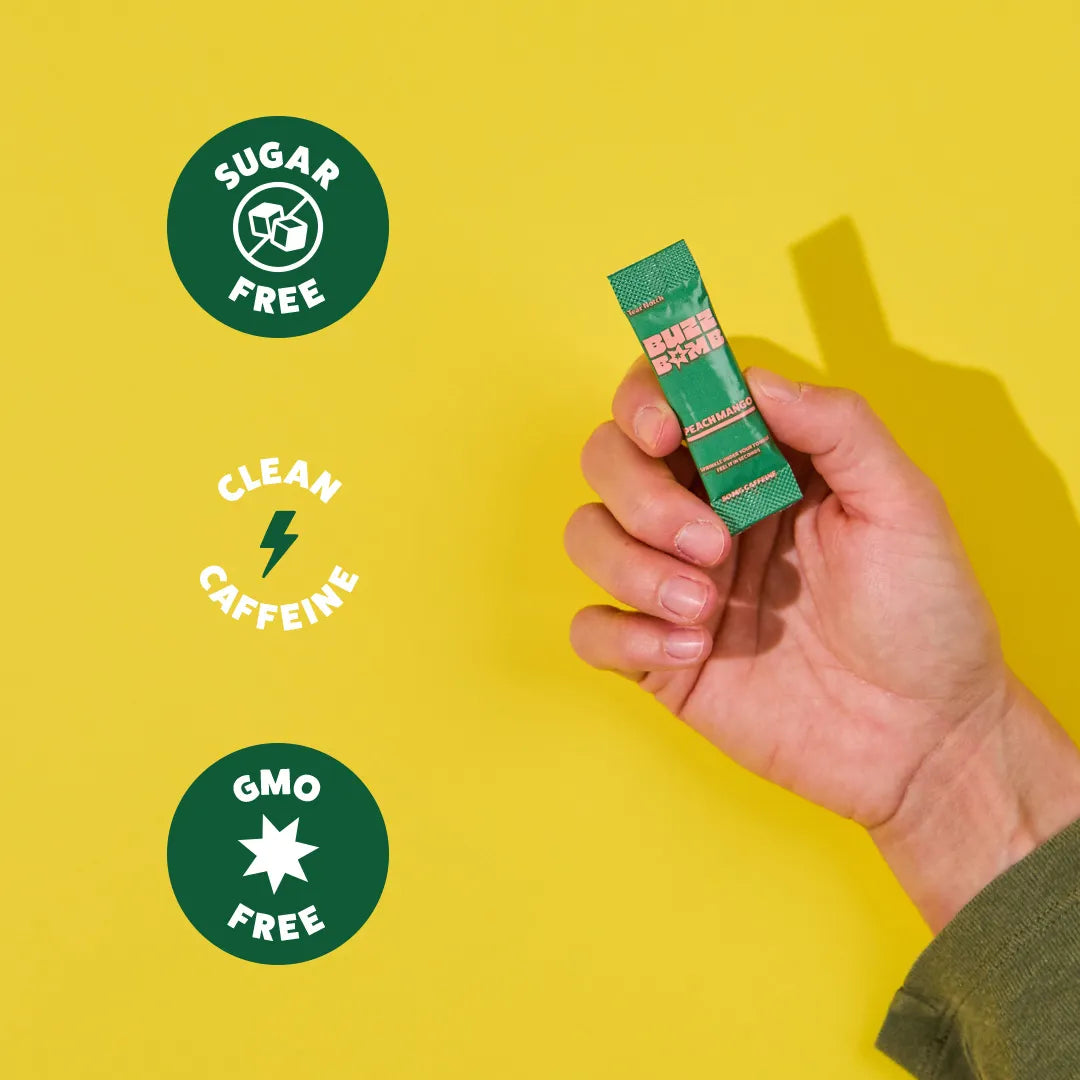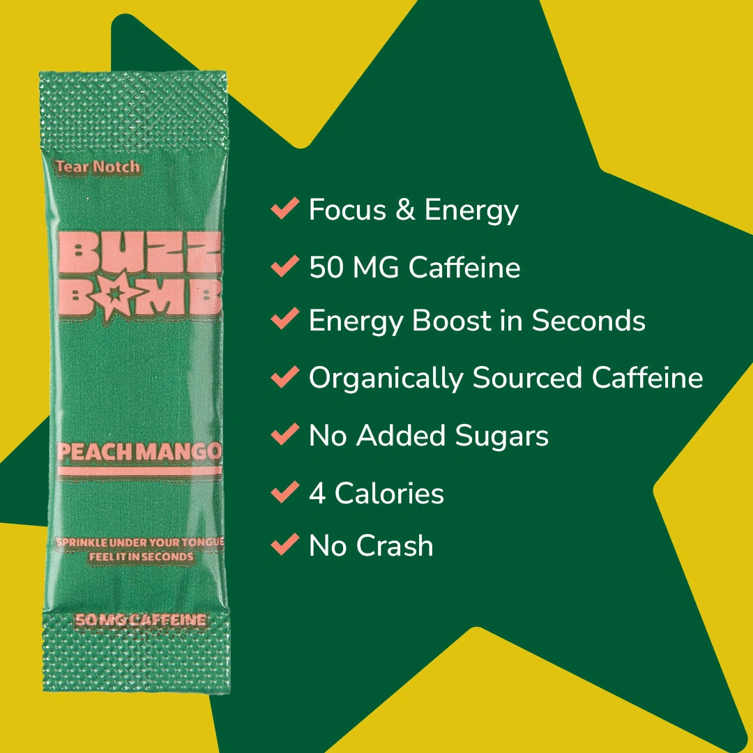 , tart, tasty. This 20 pack of Buzz Bomb’s 50 mg caffeine sticks has all-natural energy, no sugar, and a delicious Peach Mango flavor. Try quick dissolving, built-for-busy-lives energy that leaves a great feeling in your mind AND body.