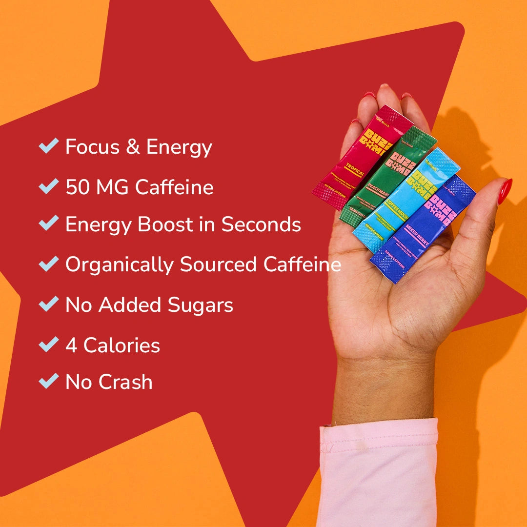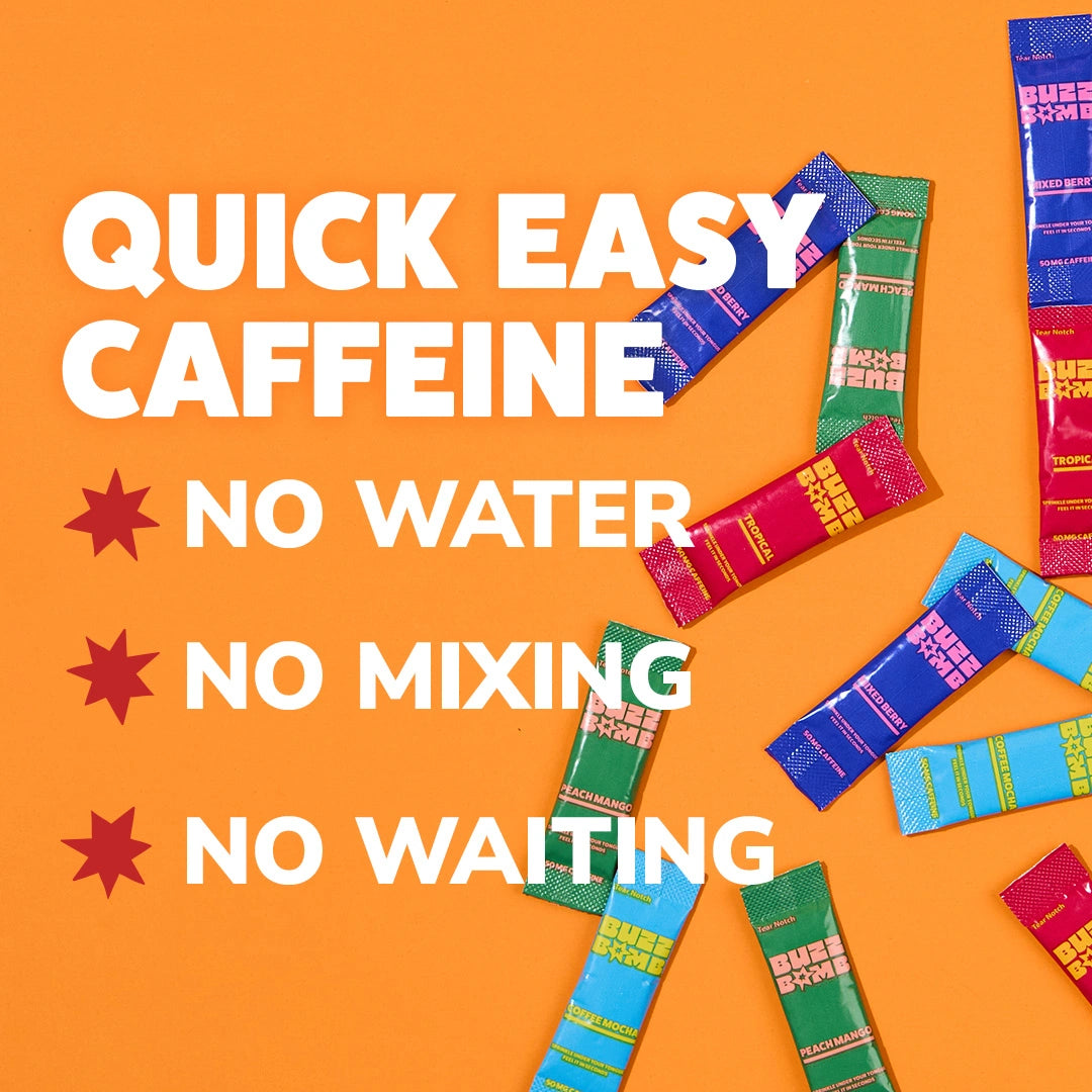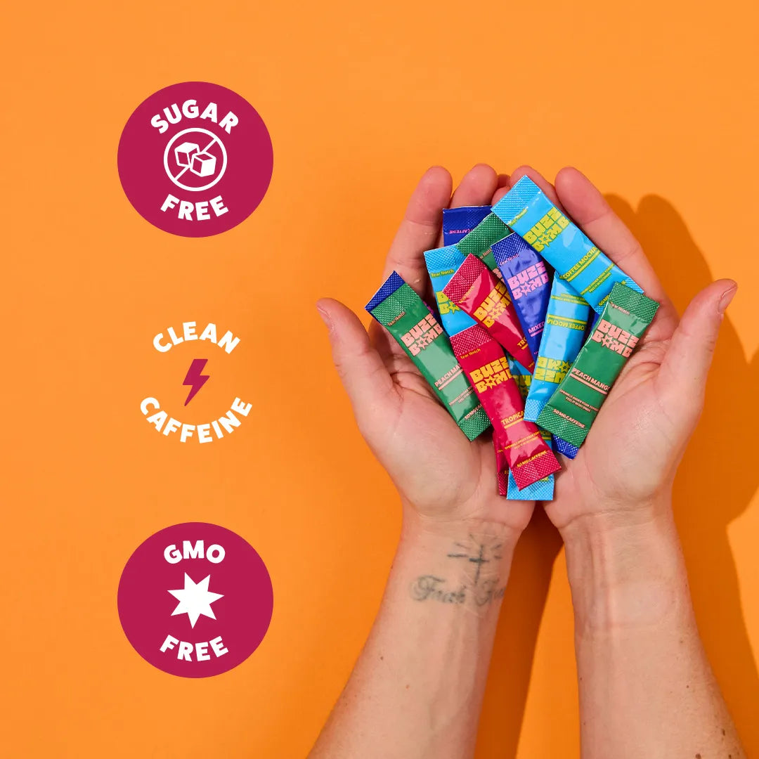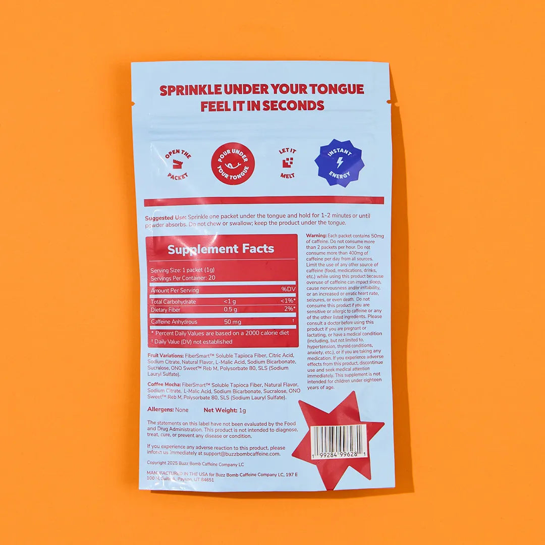 Experience our no-crash, energy buzz in every flavor with Coffee Mocha, Mixed Berry, Peach Mango, and Tropical. This variety pack of 20 Buzz Bomb 50 mg caffeine sticks will give you a burst of energy AND give you 4 different delicious sugar-free options. Try quick dissolving, built-for-busy-lives energy that leaves a great feeling in your mind AND body.